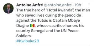 Ambasaderi w’u Bufaransa, Antoine Anfré, yagaragaje ko umusirikare w’Umunya- Sénégal wari mu butumwa bw’amahoro bwa Loni mu Rwanda (MINUAR) mu gihe cya Jenoside yakorewe Abatutsi, Capt Mbaye Diagne ari we ntwari ya nyayo yarokoye Abatutsi bari bahungiye muri Hôtel des Mille Collines.